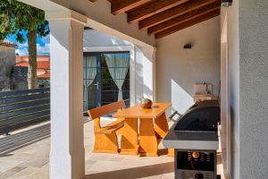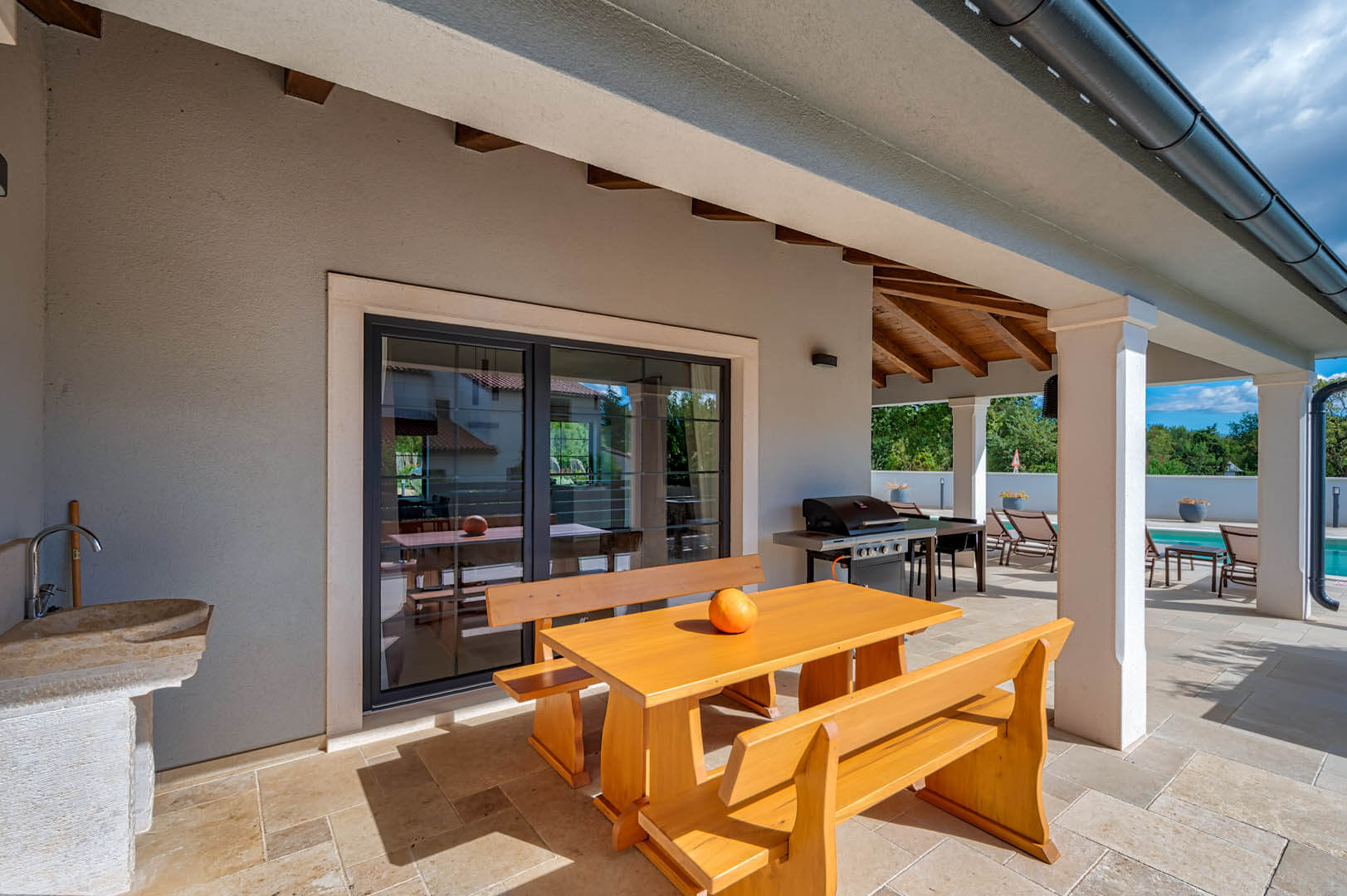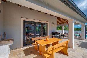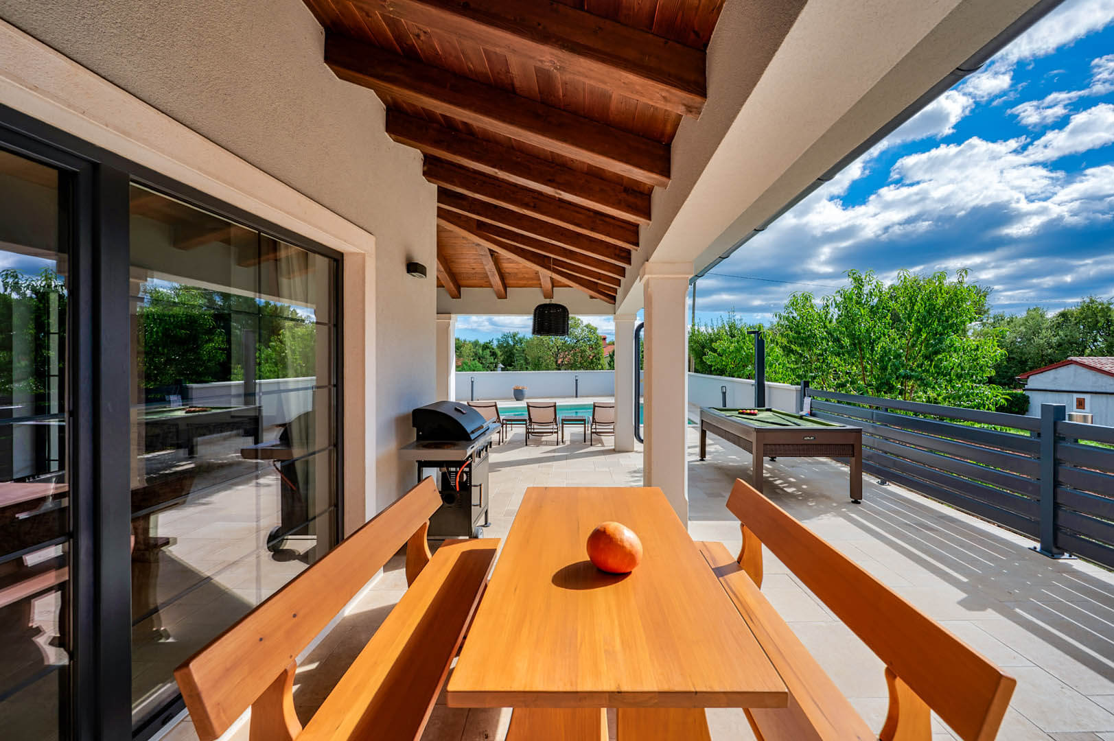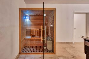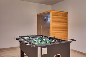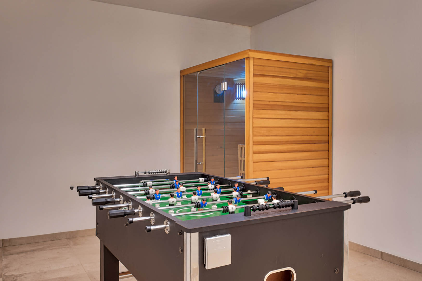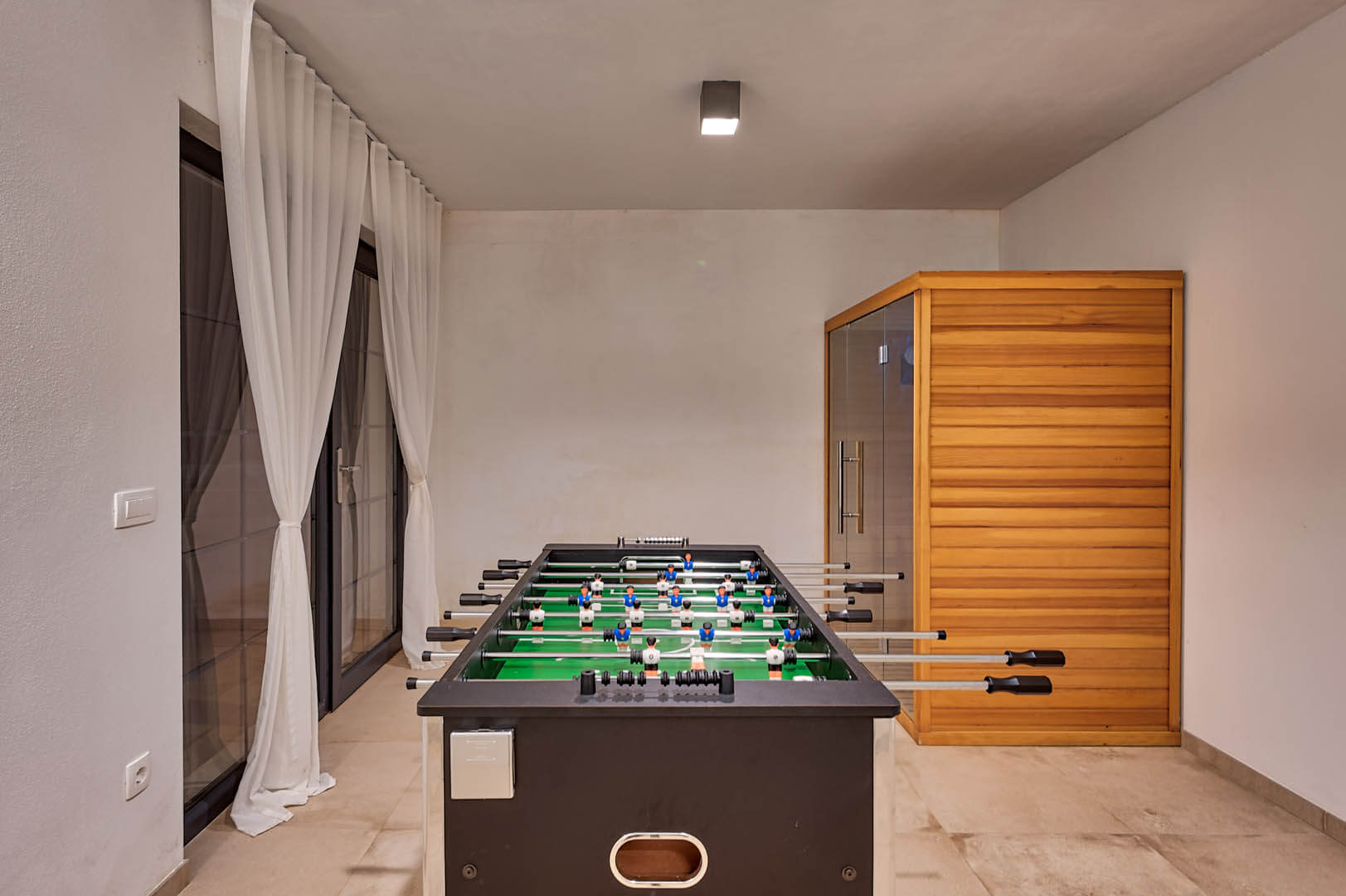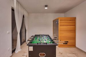The villa also offers two spacious terraces, perfect for relaxing in the shade during hot summer days. Additional amenities include a sauna and an outdoor grill. For entertainment, guests can enjoy a pool table, table football, and table tennis.