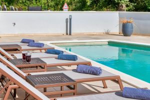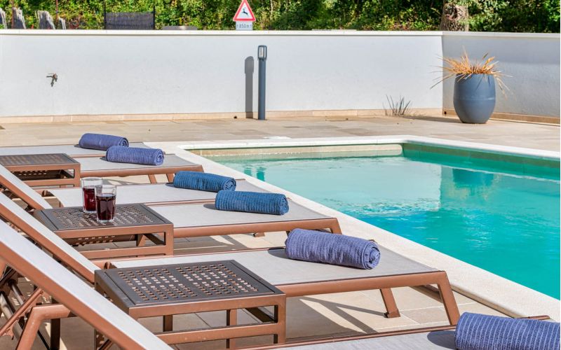 The property includes private parking for three cars and is fully fenced. A spacious 43 m² pool, which can be heated for added comfort, is at your disposal. The villa features four bedrooms, each with an en-suite bathroom. All bedrooms are equipped with air conditioning and televisions, while the bathrooms boast elegant glass-enclosed showers.
