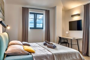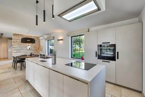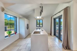 A large kitchen and living room are outfitted with a variety of appliances for preparing food and drinks, such as a toaster, coffee machine, and microwave. For added comfort during colder days, underfloor heating is installed throughout the villa.