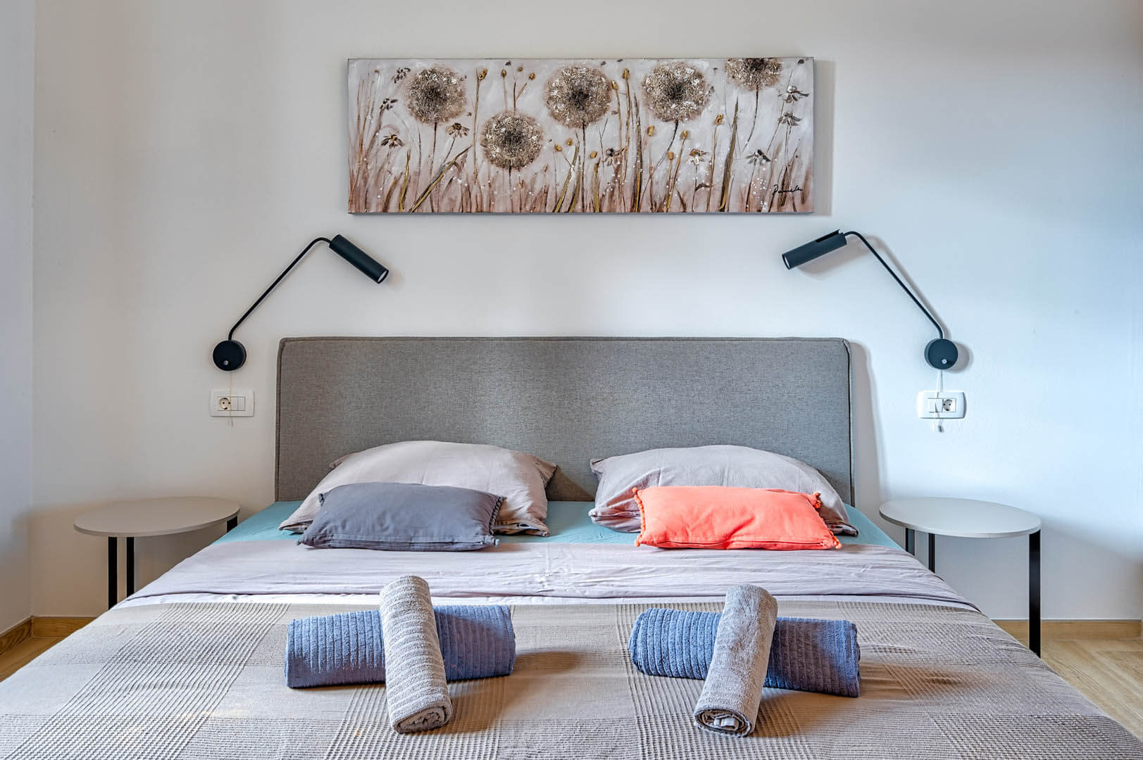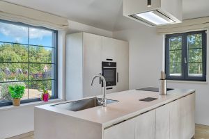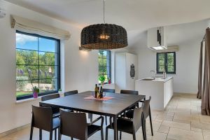 A large kitchen and living room are outfitted with a variety of appliances for preparing food and drinks, such as a toaster, coffee machine, and microwave. For added comfort during colder days, underfloor heating is installed throughout the villa.