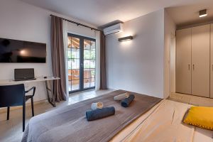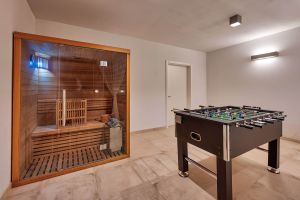 The villa also offers two spacious terraces, perfect for relaxing in the shade during hot summer days. Additional amenities include a sauna and an outdoor grill. For entertainment, guests can enjoy a pool table, table football, and table tennis.